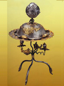 蕾鈕摩羯紋三足架銀鹽臺(tái)——唐煮茶過(guò)程中需要加入鹽