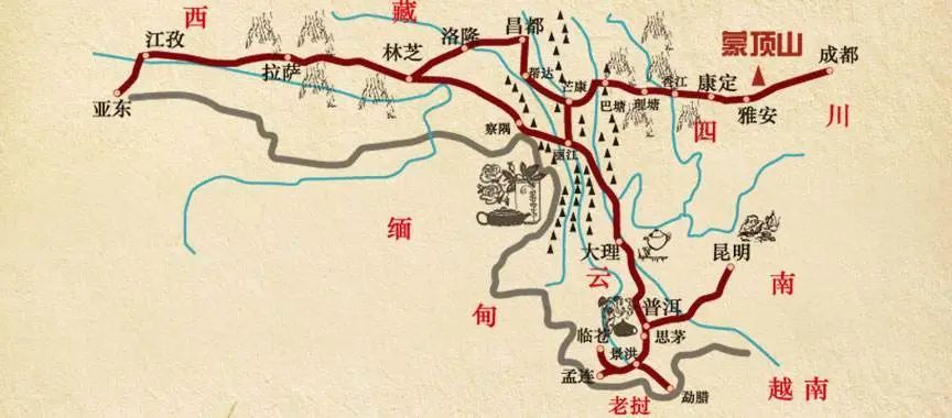 之后,順其自然地就出現(xiàn)了滿足這種貿(mào)易形式的貿(mào)易通道。古代交通方式有限,“馬幫”就成了為交換“馬匹”和“茶葉”貿(mào)易提供服務(wù)的運(yùn)輸商。隨著“茶馬互市”規(guī)模的擴(kuò)大,一條條古道被相繼探索發(fā)展出來,隨著歷史的發(fā)展,人們逐步將這些道路統(tǒng)稱為了“茶馬古道”,一個(gè)聽起來還有點(diǎn)浪漫的名字。