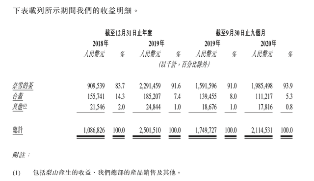 招股書顯示,2018年、2019年,奈雪的茶營(yíng)業(yè)收入分別為9.1億元,22.91億元,2019年前三季度、2020年前三季度營(yíng)收分別為15.92億元、19.85億元,2019年之后,該業(yè)務(wù)營(yíng)收貢獻(xiàn)占營(yíng)收總金額的比例提升至91%以上。