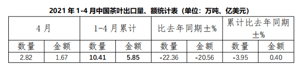 2021年1-4月,中國(guó)茶葉累計(jì)出口量為 10.41萬(wàn)噸,同比減少3.95%,出口額為5.85億美元,同比增長(zhǎng)0.40%,1-4月出口均價(jià)為5.62美元/千克,比去年同期上漲4.54%。