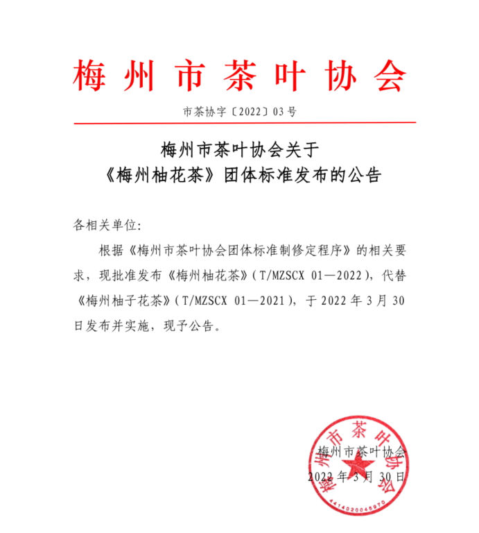 梅州市茶葉協(xié)會關(guān)于 《梅州柚花茶》團(tuán)體標(biāo)準(zhǔn)發(fā)布的公告